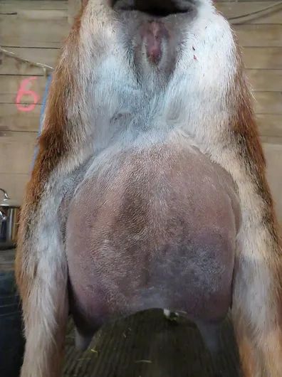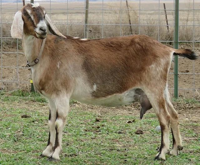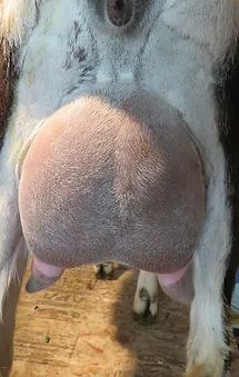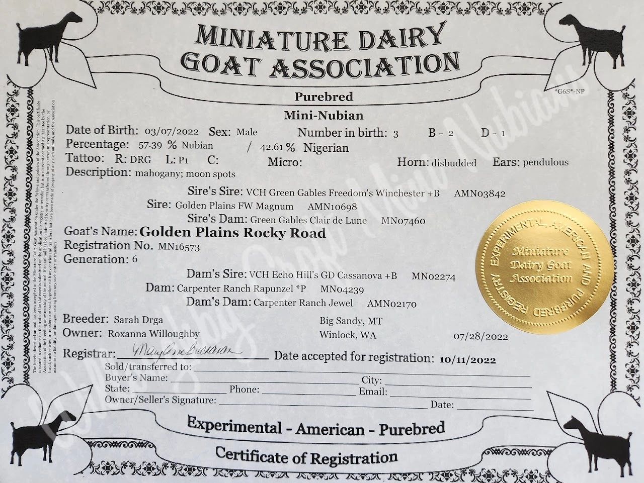 Rocky's dam has her milk star and her sire has his +B! His sire's sire is a finished champion with his +*B. Check out all the milk stars & finished champions in his pedigree. We love his long, solid ears and moon spots! He is the spitting image of his sire, Golden Plains FW Magnum.