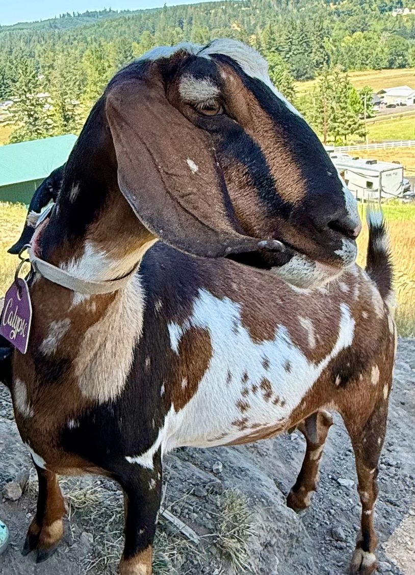 Calypso is our beloved herd matriarch and one of the best milkers on the farm! Her milk is rich, delicious, and so creamy that even the kids request her milk by neame-they say it tatstes just like cows milk. Calypso blessed us with twin doelings in 2024 who inherited her stunning color and sweet, gentle temperament.